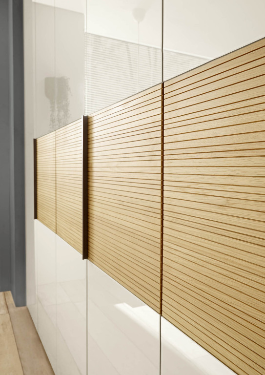 Front Glas champagner, Mitteltüren mit Querriegel massiv mit Rillenstruktur, Griffe Schiefer, ohne Kranzleiste, Türen gedämpft, 6-türig, BHT ca. 300/216/58 cm